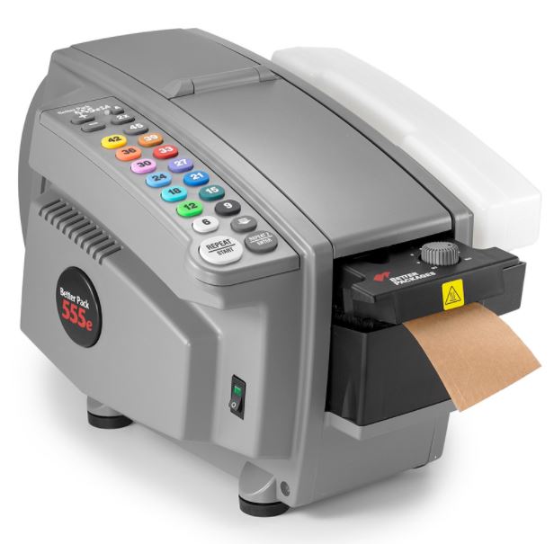The Better Pack 555eSA is an electric water-activated tape dispenser (also known as a paper tape dispenser, gummed or gum tape water-activated tape dispenser) made for fast-paced shipping and packaging environment. This machine is calibrated in inches and has a voltage of 115V.