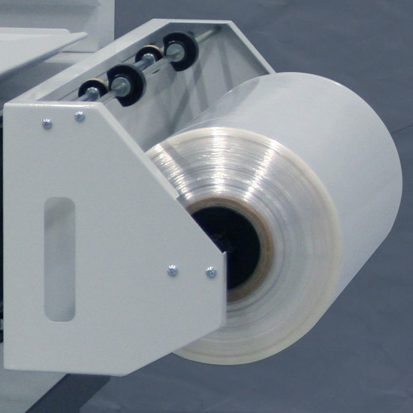 Mobile product-holding plate, loose from the film reel support to allow a better adjustment of the film to the pack size
