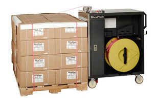 Designed to speed the placement and tensioning of strap around palletized products, the RQ-8Y/PLT can cut the time it takes to strap pallets in half when compared to hand tools. The RQ-8Y/PLT is recommended for applications where automated equipment is too expensive or impractical and hand tools are too slow. The strapping process is simple and easy. Simply position the track inside the pallet void by moving the machine on the easy rolling casters, push the feed button and insert the end of the strap in the top of the RQ-8Y/PLT. The RQ-8Y/PLT feeds the strap down to the head, tensions, seals, cuts and releases the strap. With a torque tension system, the RQ-8Y/PLT achieves the consistent high tension required to pull together columns of boxes on a pallet. As an option, the machine can be modified to use polyester strap.