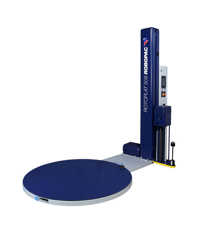 ‘ Lock in the best wrap settings for up to six completely unique load configurations and save them. Your operator can then recall the appropriate program over and over with a touch of the control panel. This ensures that you to wrap your loads correctly every time, providing ultimate load protection and film savings time after time.Control Panel –Robopacs Intuitive 7 Inch Color Touchscreen makes it easy to set up the correct parameters for wrapping each of your loads. You control containment force, rotation speed, roping and banding at 9 levels on each load. Rotoplat 508 PDS Power Pre-Stretch Roll Carriage –Robopacs Patented S Winding Pattern Roll Carriage with Quick Load System provides 40% more film contact than the W Winding pattern commonly used by competitors. This provides better control of film through the roll carriage and ensures that you get 250% prestretch on each of your loads. This will protect your products from damage while at the same time reducing your film usage. Turntable Base – The Rotoplat turntable is supported by 28 heavy duty casters and can handle a 4,400lb load. Weight capacity can be increased quickly and easily to 5,500 lbs. Machine Construction –The Rotoplat was designed for the demanding American customer. It includes many performance and application features that are either extra cost or not available on stretch wrapping machines from other manufacturers.